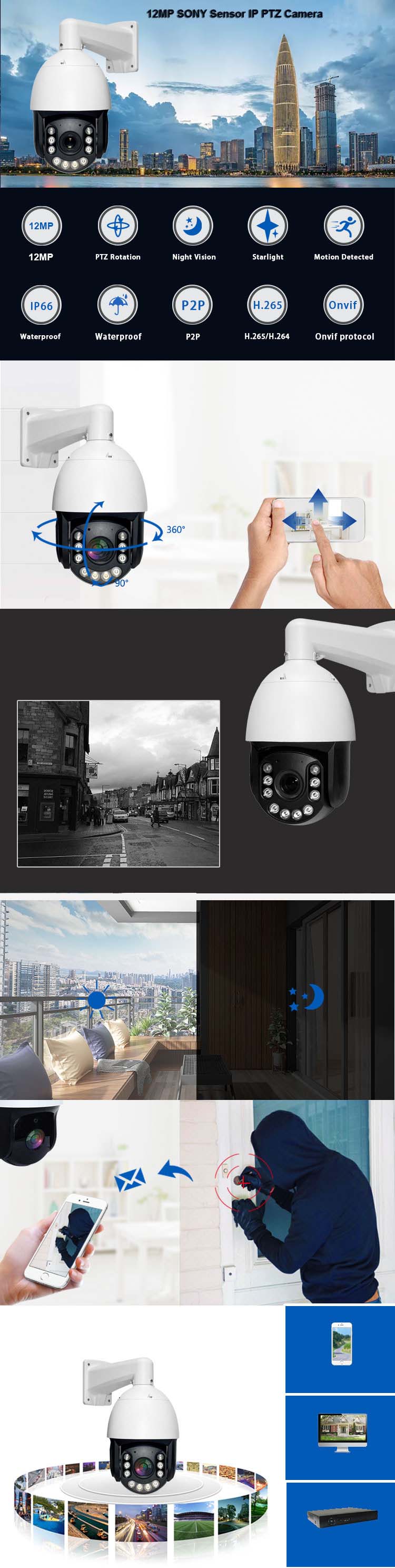 12MP Outdoor PTZ IP POE Security Camera IMX577 CMOS Sensor Auto Tracking Smart AI Human Vehicle Detection