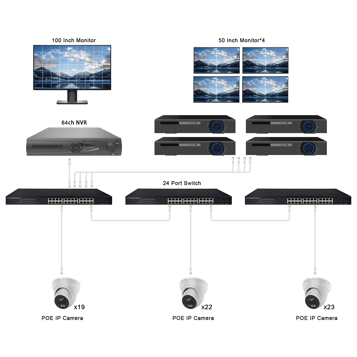 Introduction: In modern security surveillance systems, a multi-screen IP monitoring setup serves as both a potent security management tool and a key driver of operational efficiency. This article will delve into the strategic utilization of 4 Network Video Recorders (NVRs) as a substitute for conventional decoders, allowing for the construction of an efficient, stable, and multi-screen IP surveillance system that delivers clear monitoring visuals and seamless user experience.