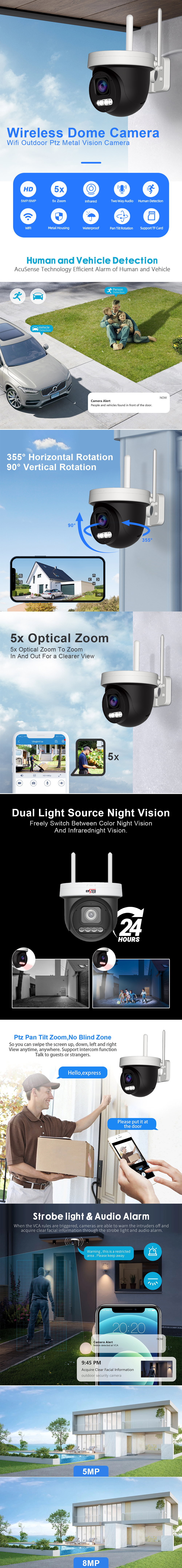 Outdoor Two Way Audio 5MP 5X Zoom Mini PTZ Wireless IP Dome Camera