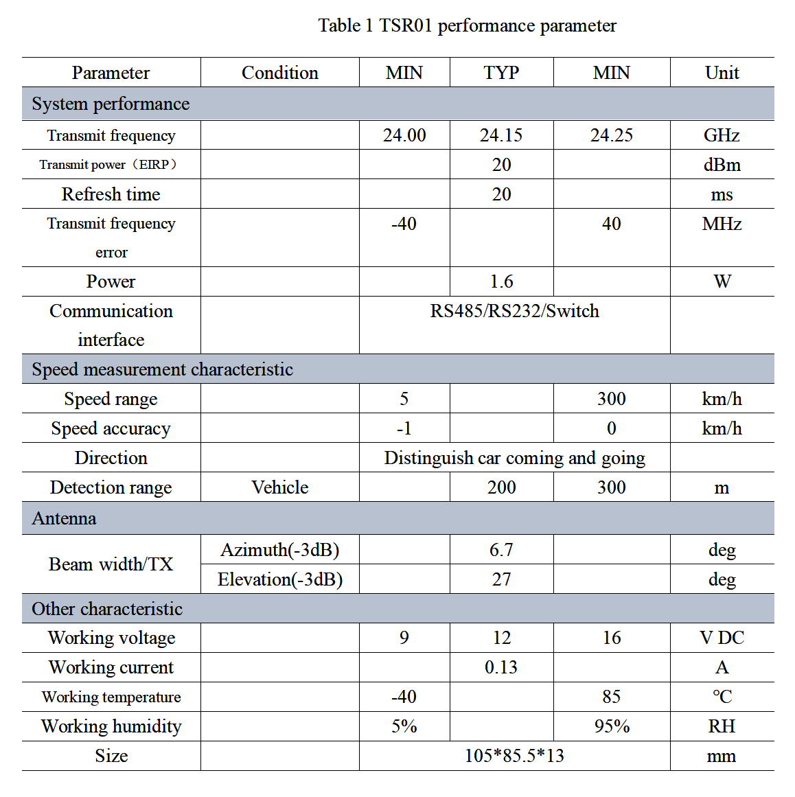 NST-TSR01 uses low sidelobe array antenna design technology to effectively avoid additional interference caused by beam divergence. The azimuth plane -3dB beam width is about 6.7 °, and the elevation plane -3dB beam width is about 27 °.