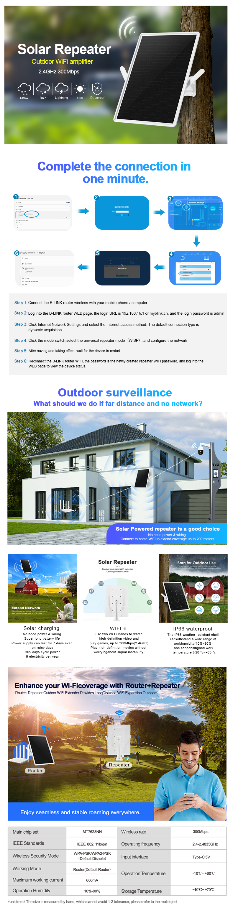 Outdoor Solar-powered WiFi repeater covering a radius of 100-200 meters